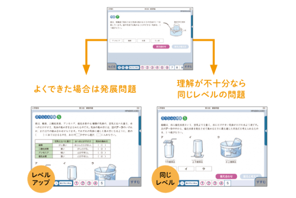 理解の仕方によって出題される問題のレベルが変わるので、子供一人ひとりに合った学習ができます。
